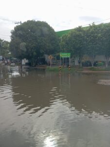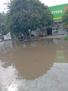 Imagen Dos: Este es otro mejor ángulo de la laguna frente a la entrada de la tienda Bodega Aurrera de la Villa Parrilla. En esta gráfica podemos mostrar más árboles que se reflejan en el estanque. Aquí se colocan muchos vendedores ambulantes que han tenido que reubicarse voluntariamente, pues el agua encharcada abarca un mayor perímetro de otros negocios cercanos. Se imagina usted cuando por este charco pasan los autobuses de pasajeros la » corredera » de la gente para evitar ser » charpiados » de agua sucia y apestosa. Chulada de postal de esta franquicia gringa que poco le interesa lo que le suceda a la clientela que concurre a comprar a sus instalaciones. Servidos amigos y vecinos…no puej !!!