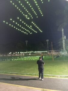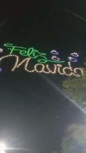 Imagen Dos: Vea este inigualable trabajo de coordinación en los drones, que en el aire formaron diferentes siluetas y mensajes de texto que eran aplaudidos por los ciudadanos en este sector de la colonia Atasta. Lugar donde, por cierto, Poncho de Nigris tuvo que bajar de su plataforma para ir a hacer pipí en los sanitarios del deportivo… Ya se imaginarán ustedes al montón de féminas tras este famoso deportista y artista. También se disfrutó del sonido original de los Súper Lamas y la banda norteña. Servidos, amigas y amigos curiosos… ¡no puej!