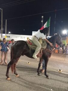 Imagen Tres: Aquí, en este espacio periodístico, mostramos tres aspectos que valieron mucho la pena de esa desorganizada caravana navideña de TITÁN. Y es que, cuando pasaron por los juzgados, eran las 10:49 de la noche; los carros alegóricos no eran muchos, pero el desorden provocó todo ese atraso. Aquí, a unos pasos, pudimos observar cuando un amable caballerango permitió la subida de un menor a este dócil animal… Y después también subió una bella fémina y todo sin novedad… ¡Acto inolvidable! Servidos, amigos atastecos… ¡si puej!