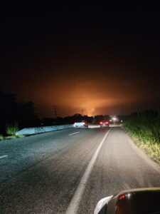 Imagen Uno: Las numerosas y sufridas familias de las dos secciones de la ranchería La Huasteca están muy desesperadas porque sus viviendas registran grietas por el funcionamiento de tres mechones que por las noches intensifican su desfogue. Esta es una gráfica a las 7 de la noche de ayer, y ellos, así nos aseguran, dicen que el Gobierno Federal les ha ROBADO su tranquilidad porque ya no pueden dormir como Dios manda.