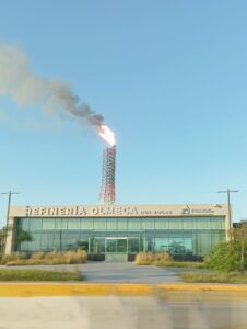Imagen Cuatro: En días recientes estuvimos por el municipio de Paraíso y vimos esta fachada de la entrada a la refinería Dos Bocas o llamada oficialmente Olmeca. Fuimos en un recorrido por la periferia de esta emblemática obra presidencial, y dichas comunidades tienen mejor panorama que antes en sus calles y diversos servicios primarios, pero llevan consigo el castigo letal de la contaminación de todo el entorno, sus casas vibran y en breve tiempo se destruirán porque el deterioro avanza. Tal vez a ellos sí les prometieron ayuda y mucha atención.